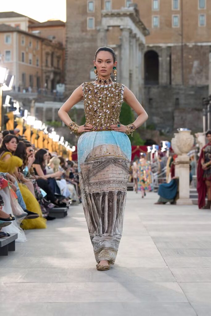 Em uma noite de imersão estética, Domenico Dolce e Stefano Gabbana transformaram a histórica Via Sacra, no coração do Fórum Romano, em passarela para sua Alta Moda 2025. Entre ruínas milenares, a marca italiana prestou uma ode à fusão entre a grandiosidade da Roma antiga e o glamour exuberante dos anos 1950 e 1960.