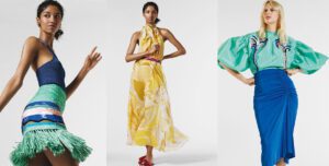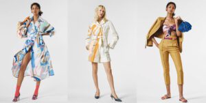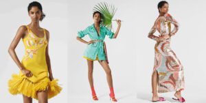 Um mix and match urbano destaca a versatilidade de crossover da coleção. Os jeans apresentam patches de sarja de seda impressa e os vestidos Marilyn em jersey impresso remetem as férias com os detalhes em ráfia e franjas, assim como os kaftans de seda em cores contrastantes.