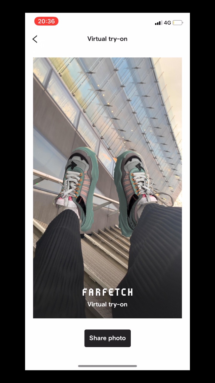 Com a tecnologia Virtual Try-on, os clientes Farfetch podem ter uma visão 360º da peça ajustada ao corpo, usando apenas a câmera do celular, de forma segura e funcional, sem a necessidade de provar pessoalmente. Os produtos com a funcionalidade estão sinalizados pelo aplicativo e para usá-la, o usuário precisa dar permissão para o sotfware ter acesso à câmera. Após seguir o passo a passo e apontar o celular para o pé, o tênis aparece e se ajusta às dimensões de casa usuário.