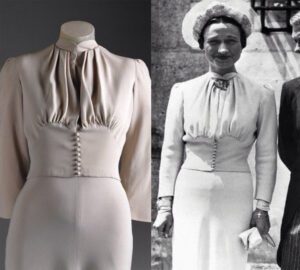 Wallis Simpson usou em seu casamento civil com Edward VIII, tio de Elizabeth II, um vestido de cintura marcada com pequenos botões. A duquesa também optou por um lindo chapéu para compor o look da cerimônia de 1936.