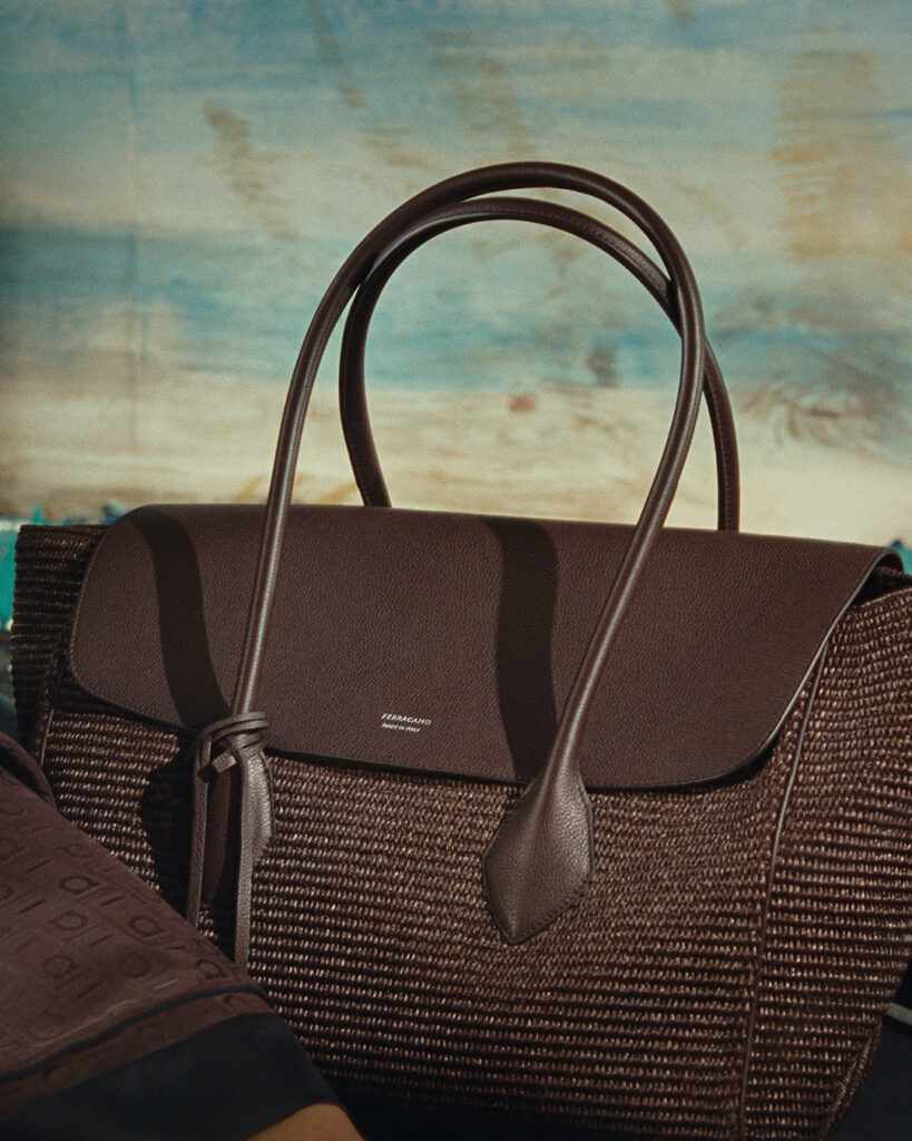 Com a chegada da estação quente, também surgem seus protagonistas: sandálias com salto esférico de cortiça e acabamentos em ráfia, bolsas Gancini trançadas à mão, slip-ons masculinos. A partir de imagens com materiais naturais que homenageiam a inovação de Salvatore Ferragamo, a câmera se afasta para revelar uma técnica cinematográfica que utiliza retalhos de tecido para criar a ilusão de ondas.