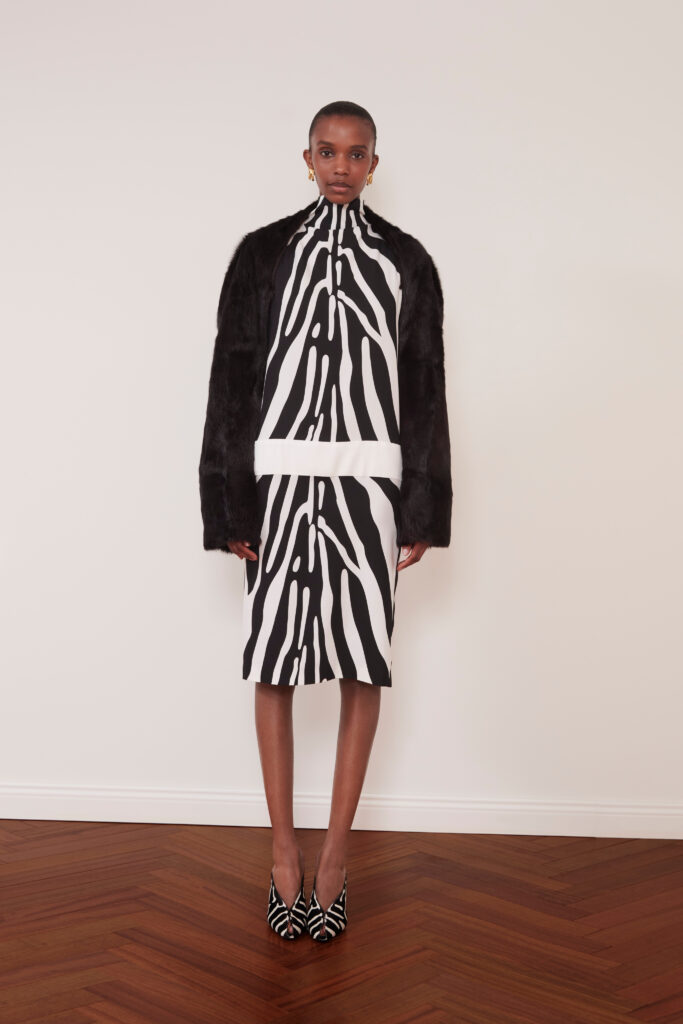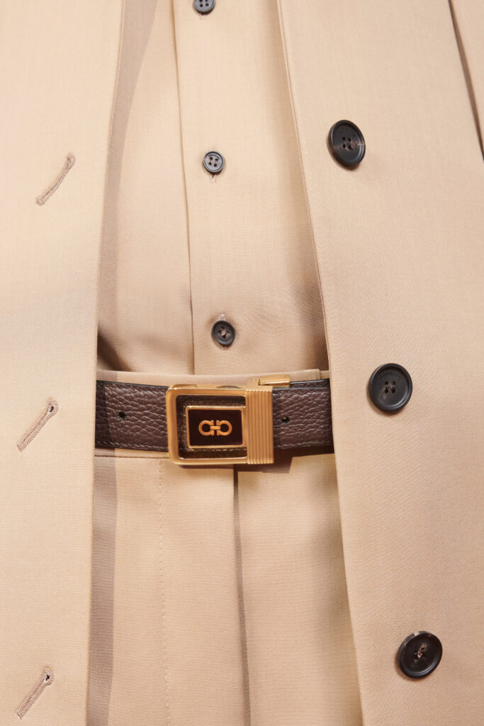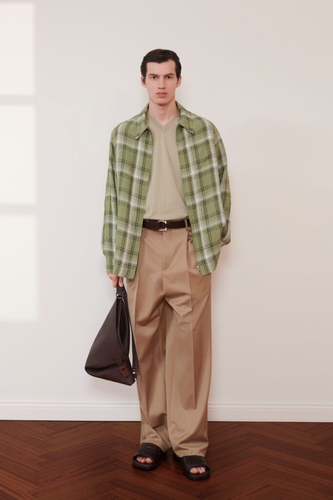 O exotismo outrora atribuído a estampas e couros de animais é reinterpretado em vestidos com drapeados que distorcem os padrões ou aparecem eterealmente sobre camisas e kaftãs elegantes. A textura do crocodilo é estampada nas pontas dos Oxfords masculinos Tramezza, dissolvendo-se pela parte superior até se transformar em um brilho envernizado. Uma estampa de lenço retirada dos arquivos da marca dos anos 1990 anima uma bolsa tipo pouch, enquanto os princípios do vestir com lenços — tão importantes para o legado da Ferragamo — são revisitados, tornando-se franjas nas barras de vestidos de cashmere ou detalhes em bolsas de lã e modelos de ombro. O que emerge é um ecletismo discreto de um guarda-roupa composto por peças queridas, pensadas e criadas para durar gerações.