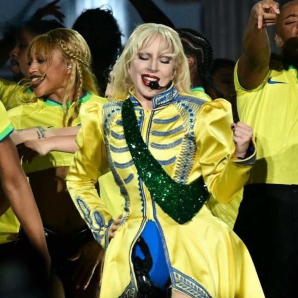 A artista ainda homenageou o Brasil e surpreendeu o público ao surgir com um look inspirado nas cores da bandeira brasileira. A cantora vestiu um deslumbrante vestido verde com mangas bufantes, acompanhado por uma faixa azul adornada com detalhes em amarelo, reforçando sua conexão com o país que a acolheu com entusiasmo. Para as performances das músicas “Zombieboy” e “How Bad Do You Want Me”, Gaga ainda acrescentou um imponente casaco amarelo, criando um visual vibrante e simbólico. A escolha do figurino não apenas homenageou o Brasil, mas também destacou a sensibilidade da artista em dialogar com a cultura local através da moda.