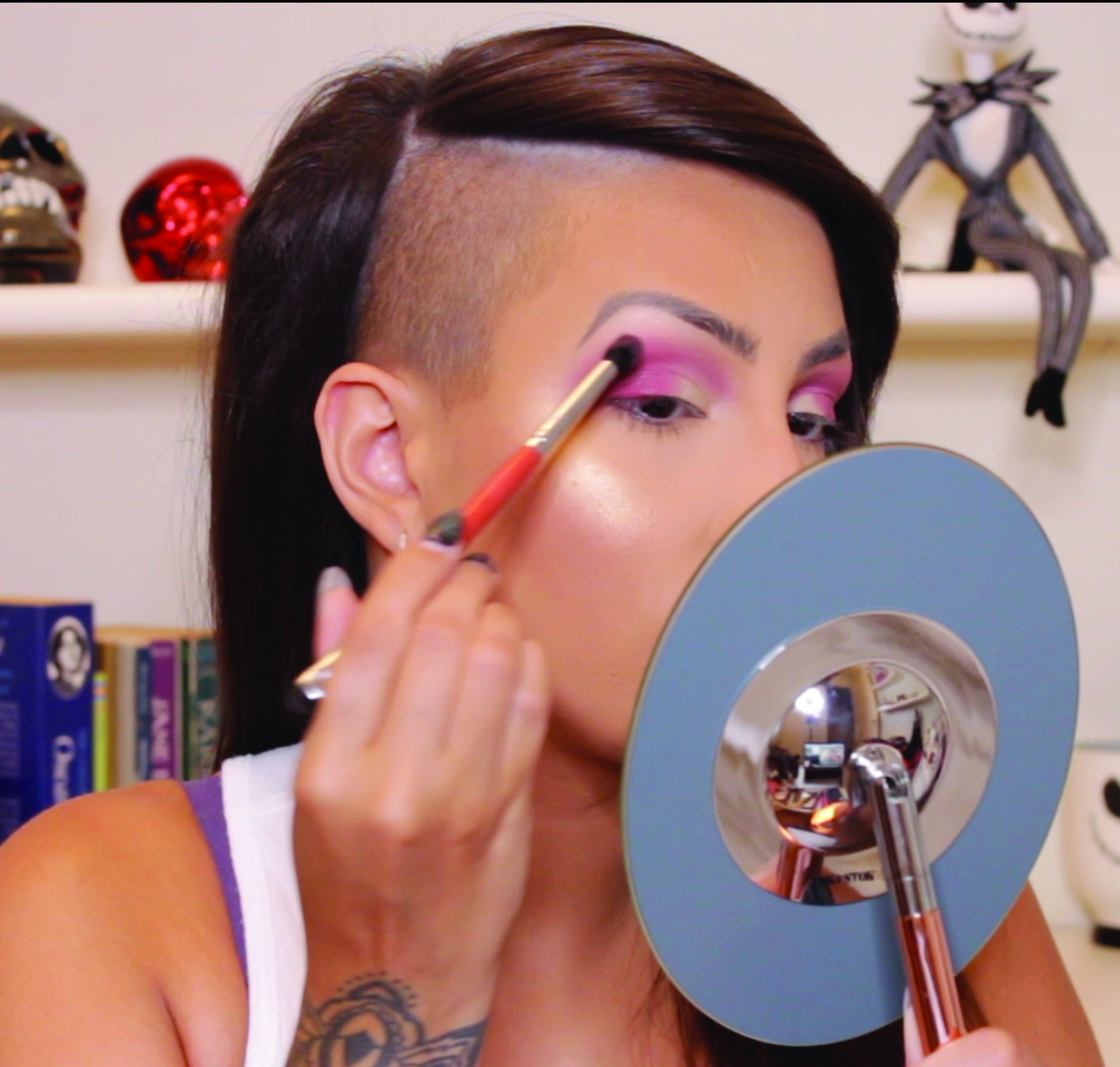 OLHOS: nessa etapa, a maquiadora explica que o segredo é esfumar! “Usei o batom MARS no dorso da mão. Em seguida, com um pincel de esfumar bem macio, pegue um pouquinho de produto dando várias batidinhas ainda na sua mão. Depois de preparar as pálpebras com primer de sombras, aplique no côncavo com batidinhas para depositar o pigmento, depois faça movimentos circulares e de vai-e-vem”. Use a cor mais clara, BELLE, para preencher o espaço da pálpebra móvel, sempre esfumando muito bem! Deixe secar e pronto!