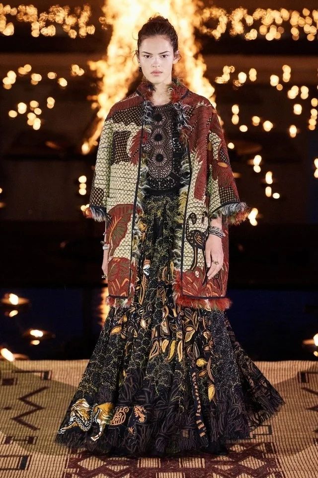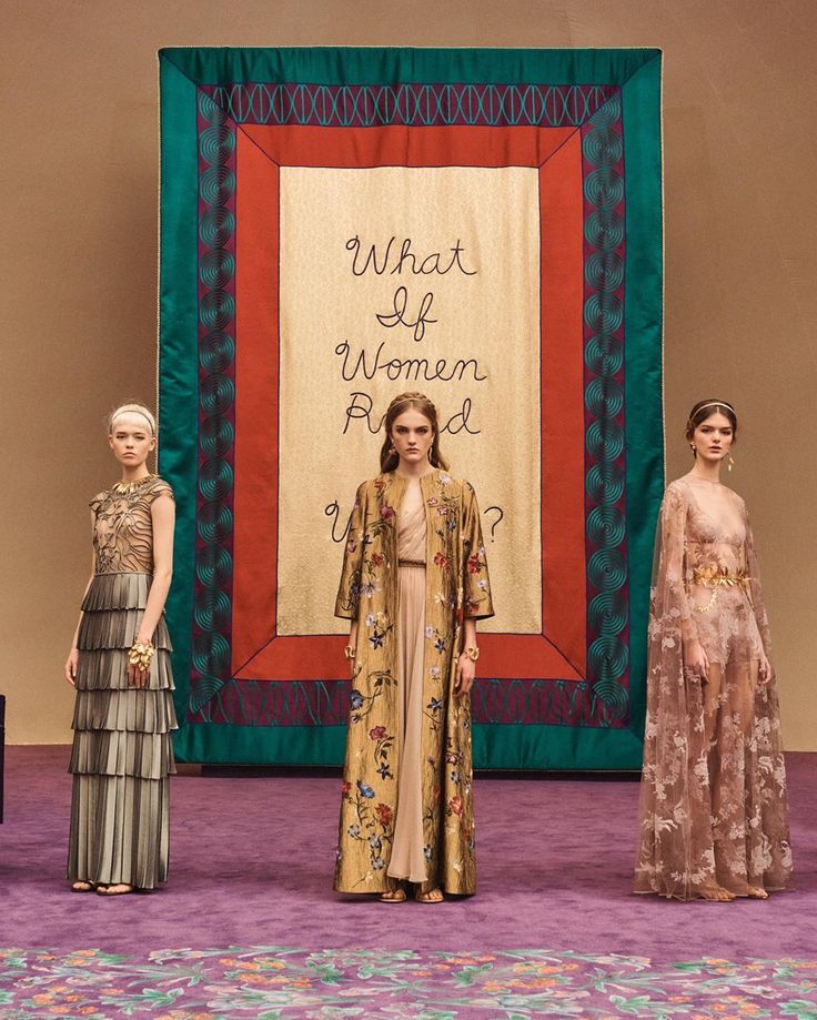 Na alta-costura, Maria Grazia também impôs sua visão. A coleção Primavera 2020, por exemplo, foi desfilada sob a instalação “What If Women Ruled The World?”, da artista Judy Chicago. Já a coleção Inverno 2023 foi inspirada na escritora e ativista negra Josephine Baker, com vestidos esculpidos em veludo e franjas evocando a estética dos anos 1920 sob um olhar contemporâneo.