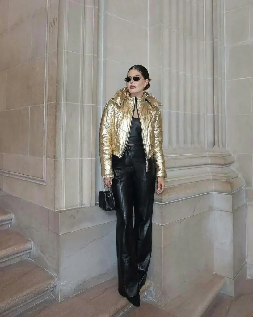 Peças metalizadas e com brilho oferecem um efeito espelhado que se transforma com o movimento. Vestidos ou blazers amplos na tendência são ideais para festas e eventos noturnos. Para um toque ainda mais expressivo, opte por itens com franjas, recortes, caimentos fluídos ou modelagens oversized, que garantem um visual jovem e glam.