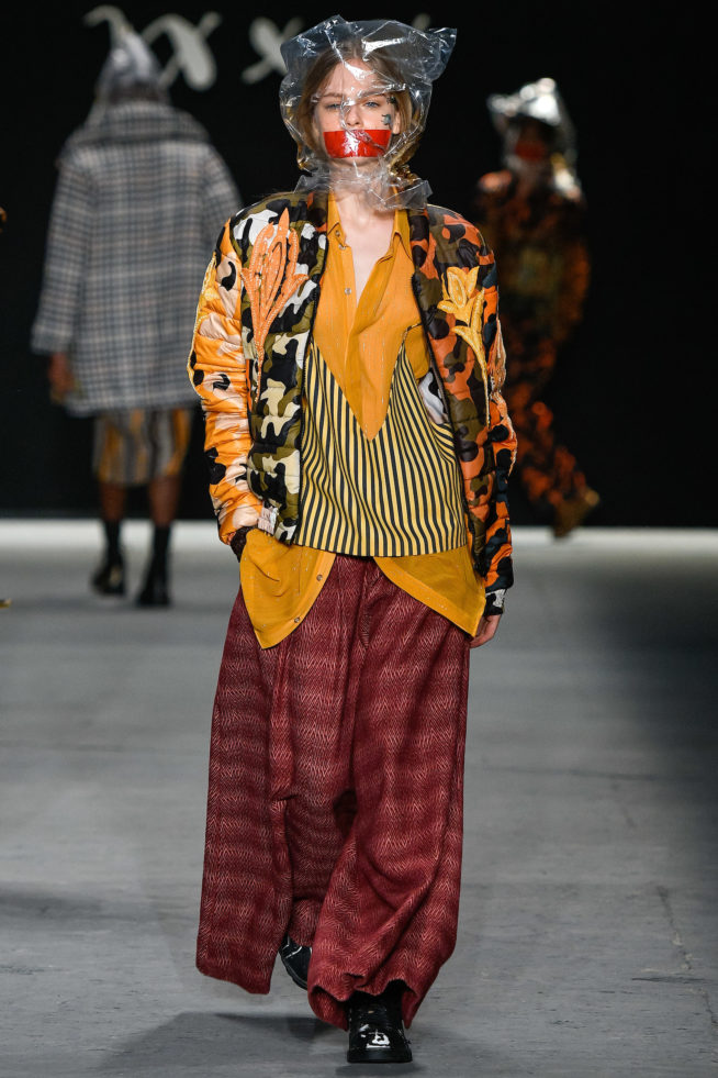 Diante dessa reflexão, João traz produções que carregam camuflados, casacos e tecidos pesados, ora acompanhados de vestidos e saias fluidas, ora com bordados pesados em um contraponto entre silêncio e liberdade de expressão. O patchwork foi inspirado na técnica oriental de remendar cerâmica quebrada com ouro, que parte do pressuposto de que aquilo que se parte poderá nunca mais ser o mesmo, mas se tornará ainda mais precioso. O xadrez e o floral também aparecem nessa mistura de elementos, texturas e cores que são características do DNA do estilista.