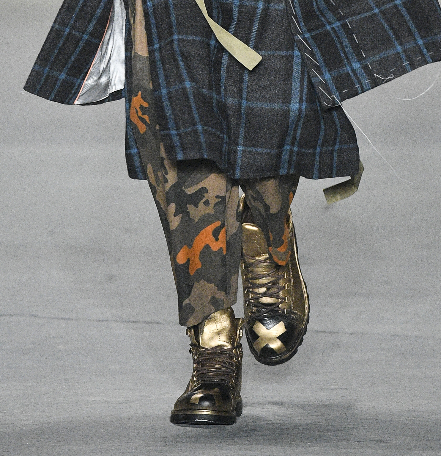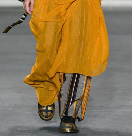 Sem dúvidas, o coturno. A bota, que surgiu no cenário militar exclusivamente para homens e hoje tem grande apelo fashion, também carrega a mensagem de censura e, ao mesmo tempo, força no caminhar. O toque de novidade fica por conta do dourado, que fez parte do design do coturno.