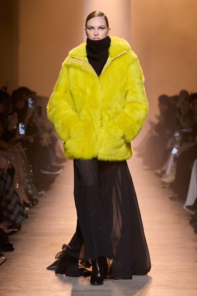 Túlio Pinto é um artista contemporâneo brasileiro reconhecido por suas esculturas e instalações marcadas pelo uso de metal, vidro e pedra. Suas composições impactantes nos convidam a refletir sobre a tensão que existente entre o peso e a leveza, a instabilidade e o equilíbrio e a força e a sutileza. O mais interessante em sua obra é sua capacidade de nos revelar a harmonia que existe nessa ambiguidade. Apesar de serem esculturas, portanto objetos tridimensionais estáticos, elas instigam a sensação de movimento e muitas vezes geram emoções contraditórias de inquietação e ludicidade, nos questionando como é possível algo tão frágil e leve como o vidro resistir a força e a estrutura do metal. Ao se tratar de uma estética que possui como principal característica a tensão entre os materiais, ora marcados pela delicadeza e fragilidade, ora pela rigidez, pela força, e pelo peso, podemos traduzi-la para a moda, por meio do uso de diferentes texturas e tecidos, o que pode ser observado no desfile Outono/Inverno 2025 de Elie Saab. A marca surpreendeu com uma coleção mais neutra e minimalista em cores e estampas, porém chamou a atenção pelo uso extravagante de texturas. Para o seu inverno, foi criado um cenário pós ski, no qual mulheres glamorosas se aquecem das baixas temperaturas da montanha. Entre os Looks desfilados podemos apontar vestidos e macacões em tons de nude e marrom fluidos usado com casaco ou colete comprido e pesado, de pele. Há também dois Looks de saia preta longa e esvoaçante, com casaco esportivo volumoso preto ou amarelo cítrico. Não podemos nos esquecer dos Looks de saias bordadas com transparência, usadas com tricots alongados.