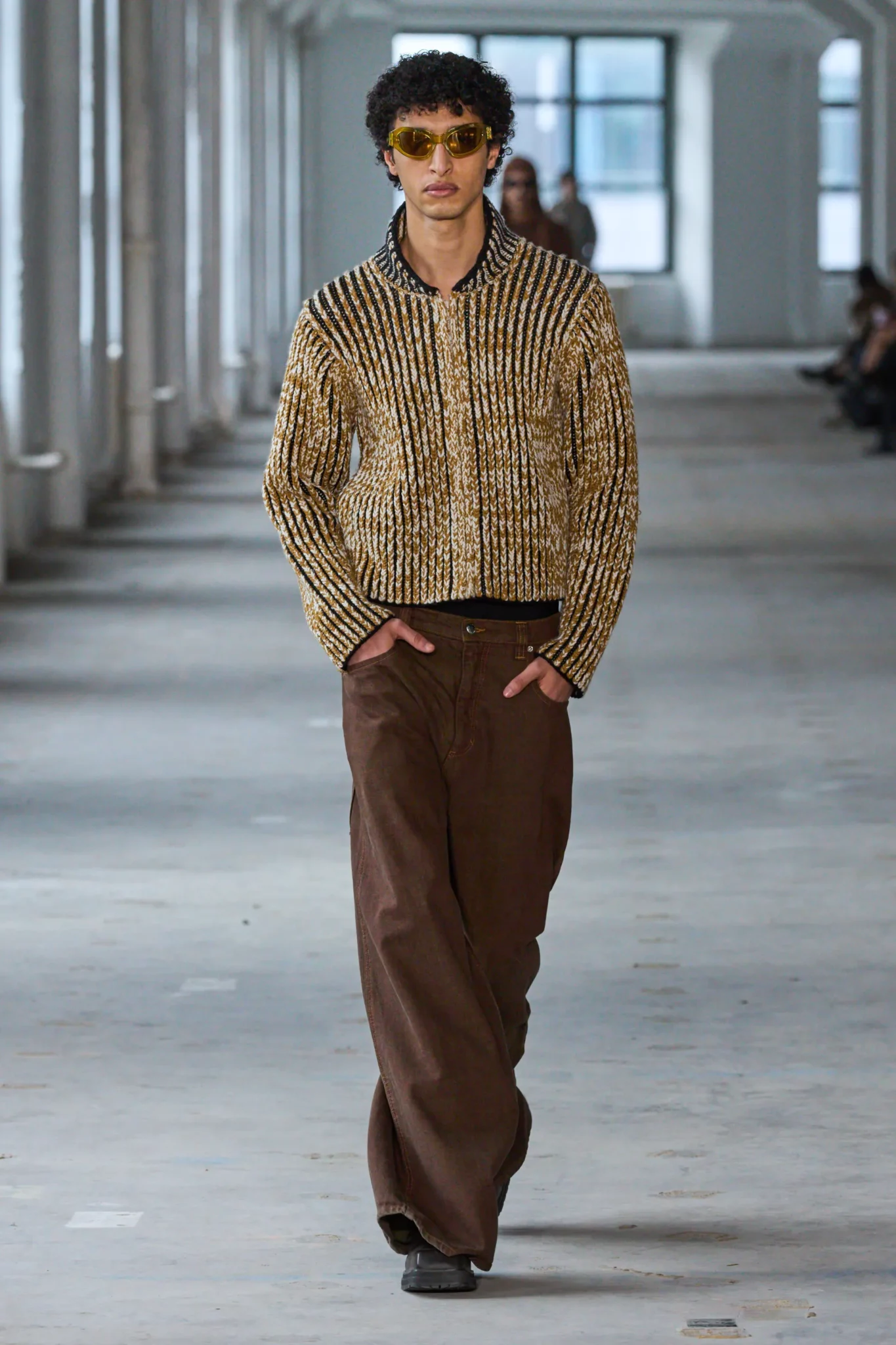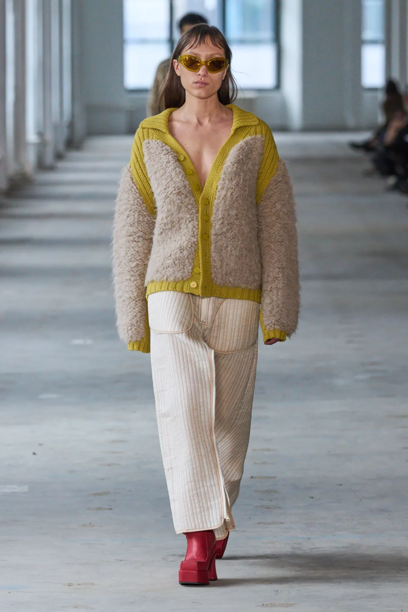 Com uma pegada mais minimalista, a marca americana busca trazer a inovação no que já encontramos em nosso guarda-roupa. Com looks femininos e masculinos, Eckhaus Latta traz aquele diferencial para os looks que já estamos acostumados a usar no dia a dia, seja por seus recortes, composições diferenciadas ou o uso de texturas. As plumas seguem em alta nesse desfile, mas dividem o espaço com looks com transparência e recortes inovadores.