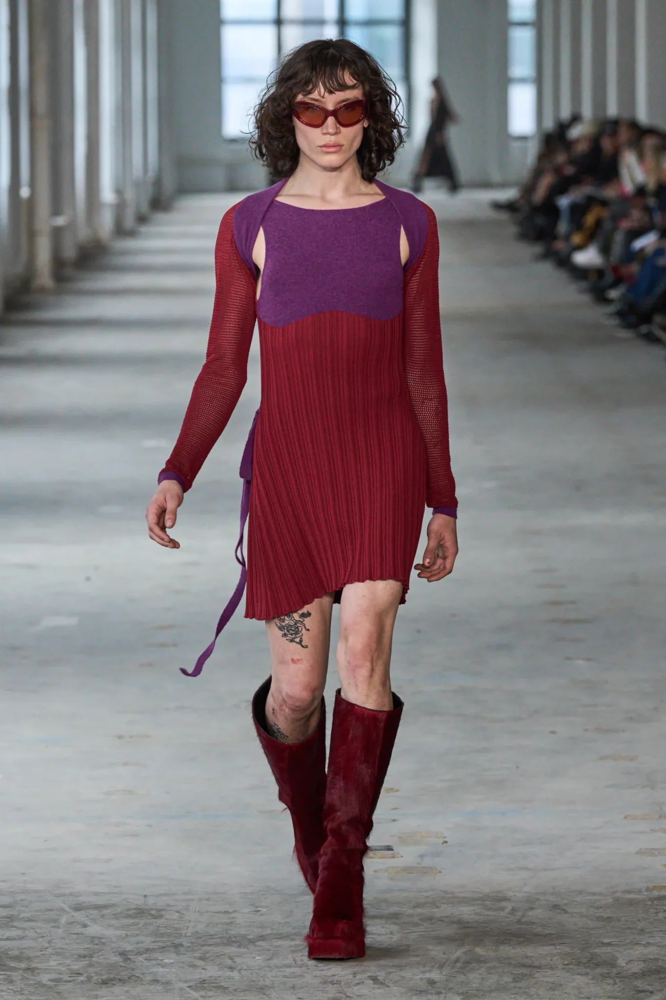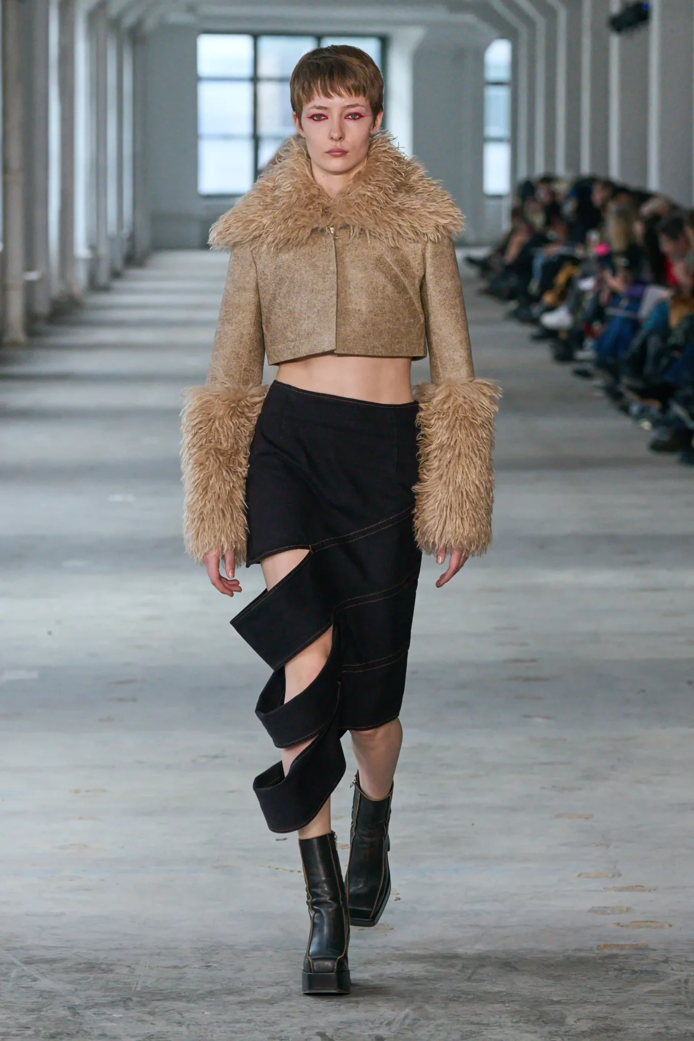 Com uma pegada mais minimalista, a marca americana busca trazer a inovação no que já encontramos em nosso guarda-roupa. Com looks femininos e masculinos, Eckhaus Latta traz aquele diferencial para os looks que já estamos acostumados a usar no dia a dia, seja por seus recortes, composições diferenciadas ou o uso de texturas. As plumas seguem em alta nesse desfile, mas dividem o espaço com looks com transparência e recortes inovadores.