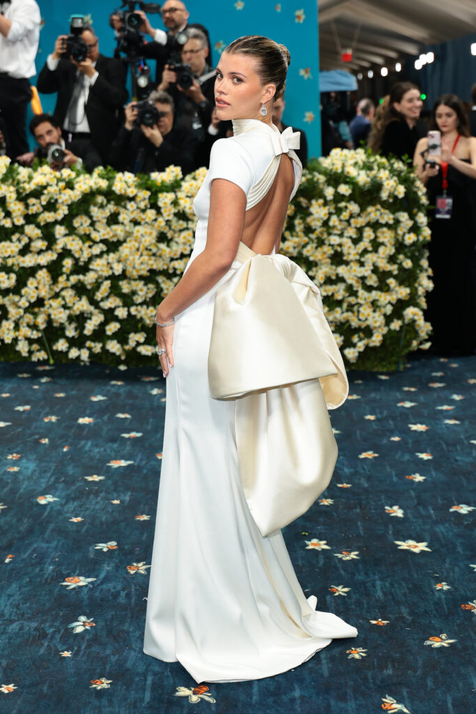 Sofia Richie Grainge vestiu um vestido branco ecru com silhueta escultural e um laço volumoso inspirado no estilo dandy. O corpete estruturado de crepe fosco se fundia com um laço brilhante em creme, de grande proporção, criando um efeito dramático. Referências à alfaiataria surgem na faixa cummerbund reinterpretada como decote e detalhe nas costas, com um visual minimalista, sensual e elegante.