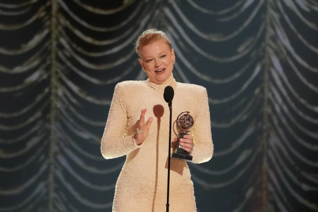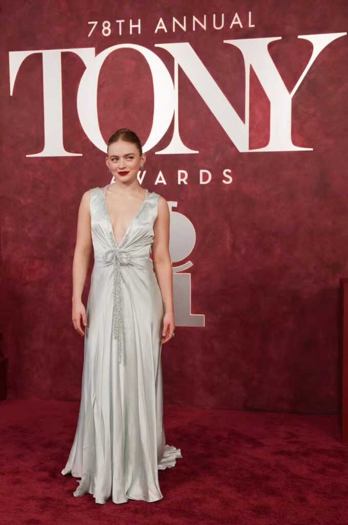 Premiada pela atuação em “The Picture of Dorian Gray”, Sarah Snook escolheu um deslumbrante vestido dourado assinado por Richard Quinn. A peça, com um trabalho impecável de tecidos metálicos e estampas dramáticas, refletiu o tema do espetáculo, que discute beleza e decadência. O look foi complementado por joias da Chopard, que adicionaram um toque extra de luxo e sofisticação, evidenciando como a moda pode dialogar diretamente com a narrativa teatral.