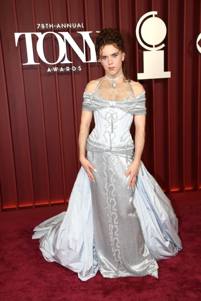 Fazendo história, Cole Escola foi o primeiro artista não-binário a vencer na categoria de ator principal em peça, por “Oh, Mary!”, e sua escolha de look refletiu essa quebra de paradigmas. Vestindo um vestido azul-claro de Wiederhoeft inspirado em Bernadette Peters, com detalhes em beading delicado, Cole mostrou como a moda no teatro pode ser uma ferramenta para comunicar identidade e sentimento. A peça uniu tradição e inovação, reverberando no público uma mensagem de inclusão e autenticidade.