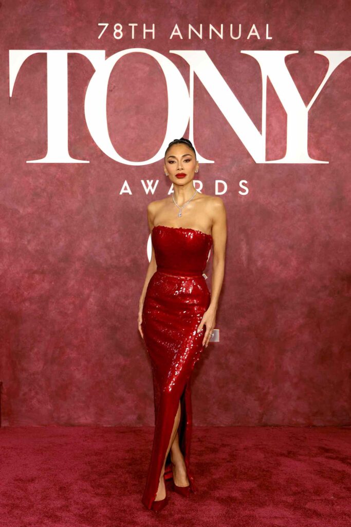 Nicole Scherzinger, vencedora por sua performance em “Sunset Blvd.”, roubou a cena com um vestido vermelho vibrante da Rodarte, adornado com mais de 50 quilates em diamantes da Kwiat. O design clássico, com cortes fluidos e um acabamento brilhante, traduziu perfeitamente o glamour do teatro clássico, enquanto o batom vermelho e o cabelo impecável completaram o visual cinematográfico, criando uma imagem inesquecível.